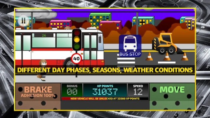 City Bus Driving Simulator 2D aicina jūs atklāt plašu un dinamisku transportlīdzekļu kolekciju, kas ietver 38 rūpīgi izstrādātus autobusu un trolejbusu modeļus, sākot no vēsturiskiem braucamrīkiem līdz mūsdienu flotēm. Katrs brauciens būs unikāls piedzīvojums, jo spēle maina gan diennakts fāzes – no rīta agruma līdz vakara krēslai, gan gadalaikus – vasaras zaļumu, rudens krāsas un ziemas sniegu. Piedzīvojiet mainīgos laikapstākļus – no mākoņainas debess un lietus līdz spēcīgām vētrām un sniegotām ainavām, kas prasa īpašu vadītāja meistarību. Nejauši ģenerētās pilsētas ainavas un maršruti nodrošina, ka divas reizes nenobrauksiet pa vienu un to pašu ceļu.