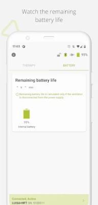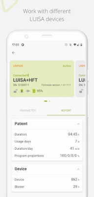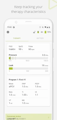 Ar LUISA lietotni jūs varat ērti sekot līdzi savai ventilācijas terapijai, izmantojot saderīgu ventilācijas ierīci. Tā nodrošina iespēju pievienot arī otru ierīci, ja izmantojat divas. Lai nodrošinātu ērtāku lietošanu naktī, ir pieejams tumšais režīms.