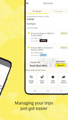 Pārvaldiet savu ceļojumu ar pārliecību un bez piepūles. Royal Brunei Airlines lietotne sniedz tūlītēju piekļuvi jūsu lidojumu maršrutam un ļauj personalizēt katru jūsu ceļojuma aspektu. Izvēlieties sev ērtāko sēdvietu, pievienojiet papildu bagāžu vai palutiniet sevi ar piekļuvi ekskluzīvām lidostu atpūtas telpām, lai atpūstos pirms lidojuma. Atvadieties no garām rindām, izmantojot tiešsaistes reģistrāciju, kas ļauj ātri nodot bagāžu un bez stresa uzsākt ceļojumu. Turklāt saņemiet reāllaika lidojumu atjauninājumus un piekļūstiet detalizētiem lidojumu sarakstiem 24/7, nodrošinot, ka esat informēts par izlidošanas un ielidošanas laikiem jebkurā brīdī.